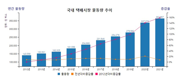 2021년 국내 택배물은 36억 2천만 개로 사상 최고의 물동량을 기록했고 2022년 역시 온라인 시장의