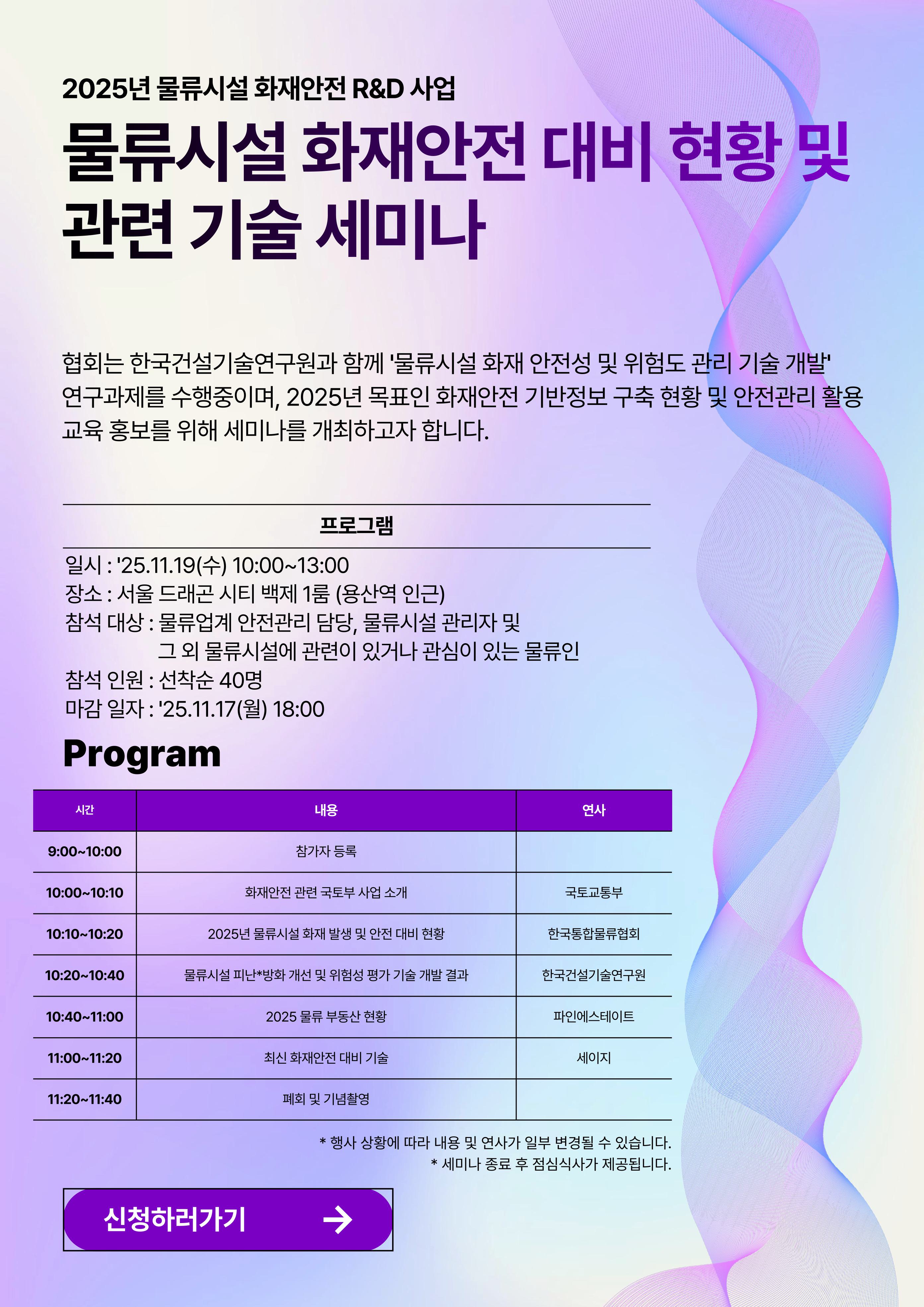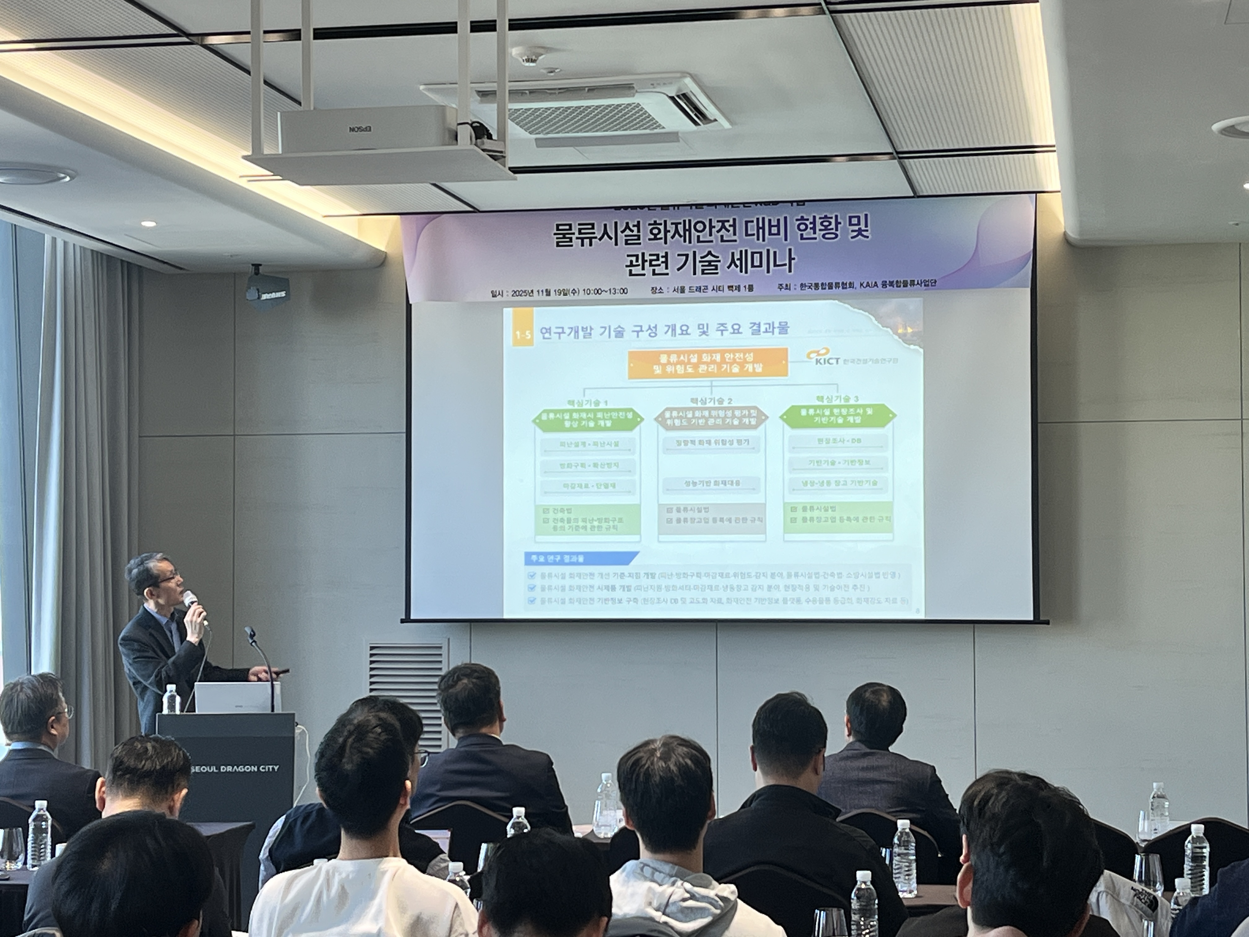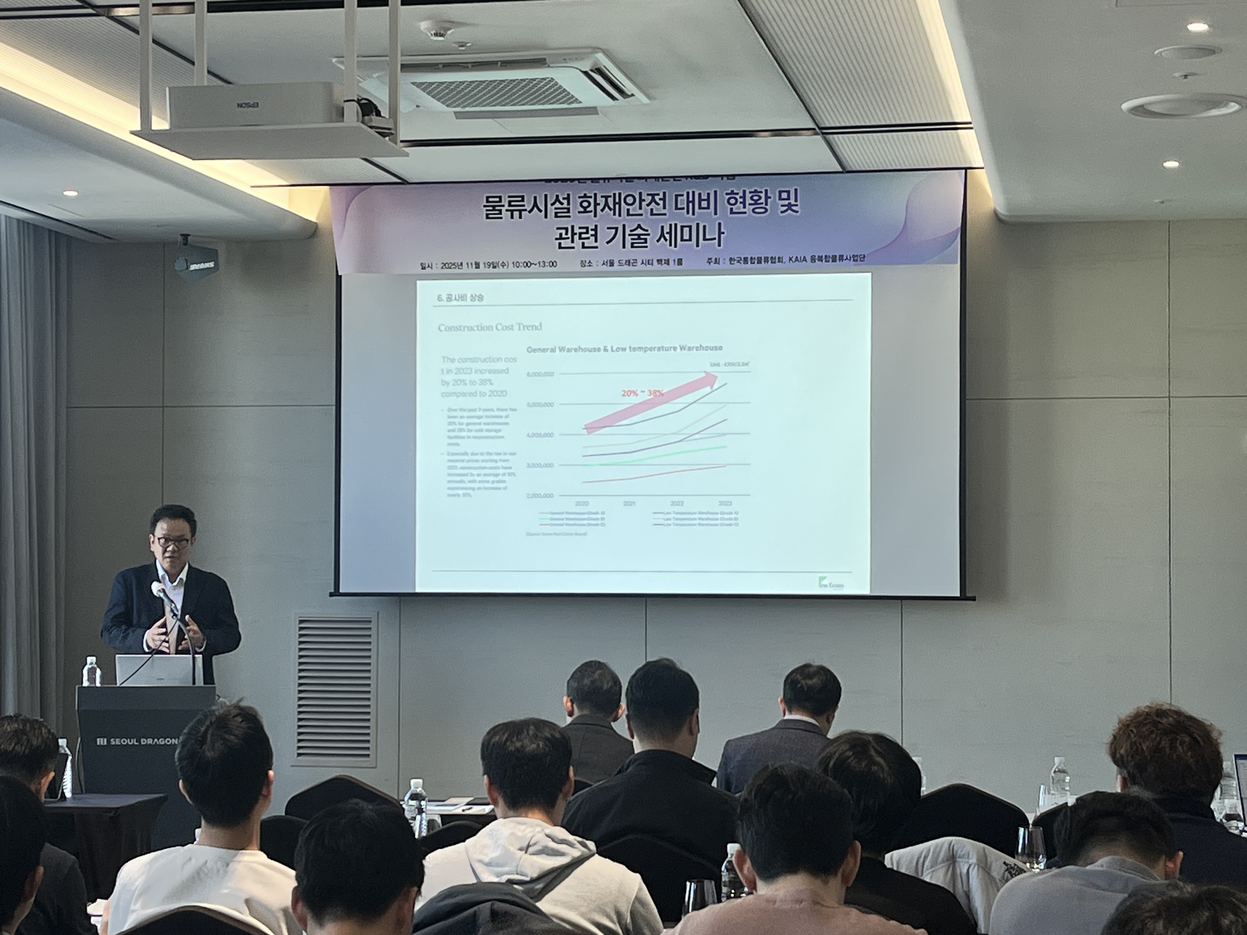 한국통합물류협회가 주최한 ‘물류시설 화재안전 대비 현황 및 관련 기술 세미나’가 2025.11.17(수)에 서울 드래곤 시티에서 개최되었다. 협회는 한국건설기술연구원과 함께 ‘물류시설 화재 안전성 및 위험도 관리 기술 개발’ 연구과제를 수행 중이며, 2025년 목표인 화재안전 기반정보 구축 현황 및 안전관리 활용 교육 홍보를 위해 세미나를 개최하였다. 한국통합물류협회 서호철 팀장은 “본 세미나를 통해 금년도 현장조사를 비롯하여 화재안전 관련 정책, 현황 등 물류시설 화재안전과 관련된 내용들을 공유하고자 한다.”라고 전달하였다.