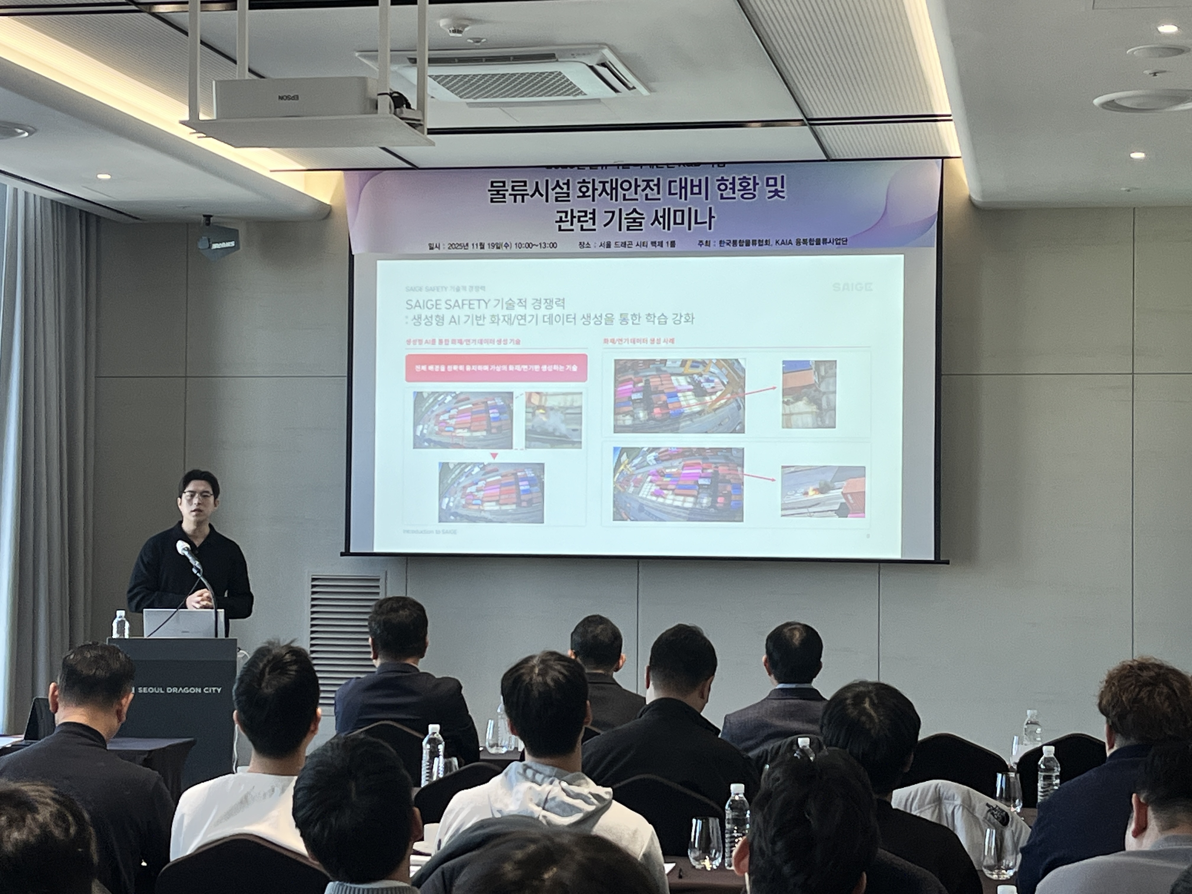 마지막으로 AI CCTV 통한 관제 등의 AI 기술을 통해 산업 안전 모니터링 솔루션을 제시하는 SAIGE SAFETY의 임광현 이사가 발표하였다. 물류 창고 화재의 위험성을 언급하며 물류산업에서의 안전에 대한 중요성을 강조하였고, 이를 위한 SAIGE SAFETY의 핵심 기술력을 제시하였다. 핵심 기술력으로는 ‘산업현장에 대한 정확한 관제기술’, ‘Depth AI 기반의 위험 영역 침입 및 중장비 협착 감지’, ‘생성형 AI 기반 화재/연기 데이터 생성을 통한 학습 강화’를 제시하였고, 이를 다수의 실제 산업현장에 적용하고 있다. 이러한 기술력을 통해 ‘기존 CCTV와의 즉시 연동’, ‘현장 특성에 맞춘 AI 감지 설정’, ‘직관적인 통계 분석 대시보드’를 주요기능으로써 제공하고 있다.