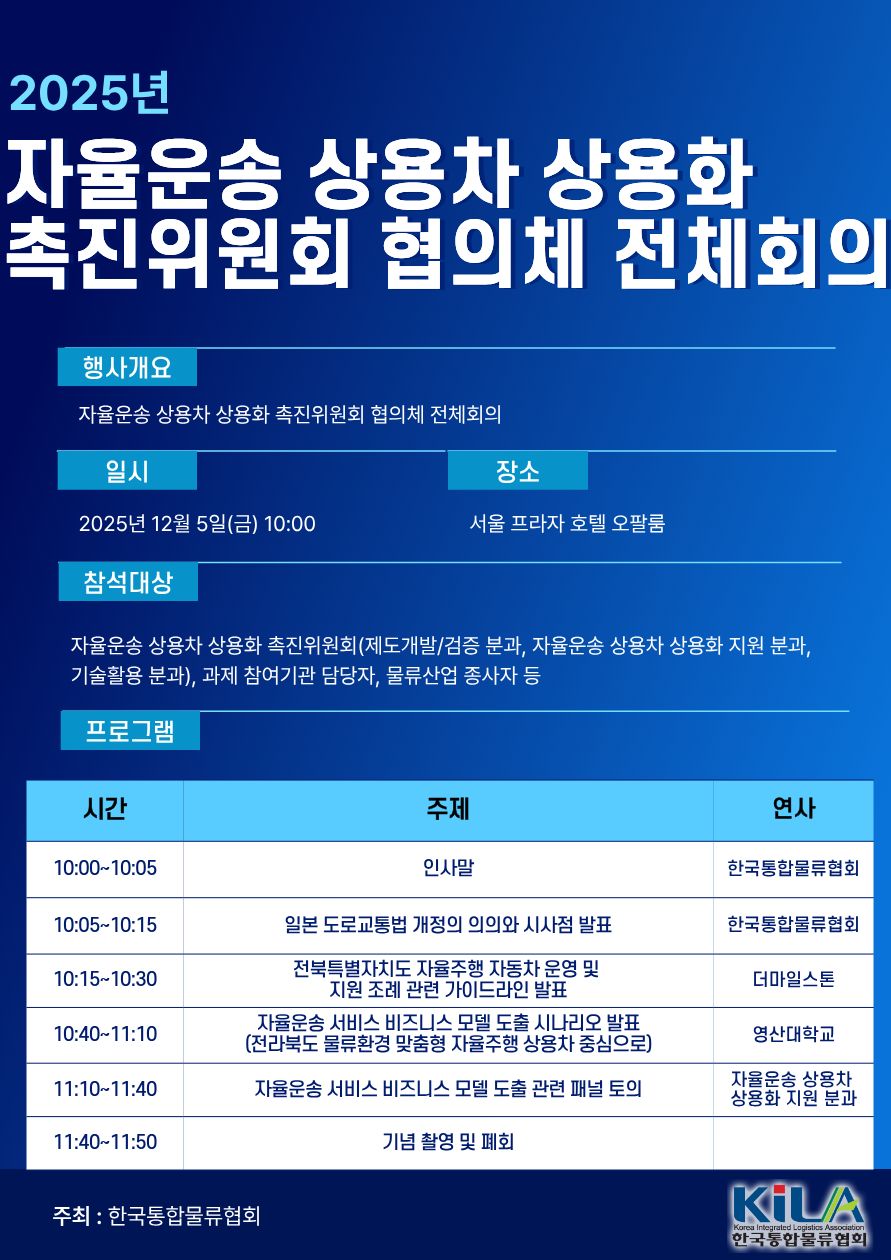 한국통합물류협회가 주최한 ‘자율운송 상용차 상용화 촉진위원회 협의체 전체회의’가 2025.12.05(금)에 서울 프라자 호텔에서 개최되었다. 협회는 ‘새만금 자율운송 사용차 실증지원 인프라 조성’ 연구과제를 수행중이며, 자율운송 상용차 선순환체계 조성 및 실증지원을 위한 의견수렴의 장으로서 자율운송 및 물류산업 가치사슬 상호연계 네트워크 조성을 위해 자율운송 상용차 상용화 촉진위원회 협의체를 구성하였다. 이번 협의체 회의는 2025년 협회 결과물을 공유함과 동시에 과제 기술 수요기업 발굴을 위한 비즈니스 모델 도출에 많은 전문가들의 의견을 받고자 개최되었다.