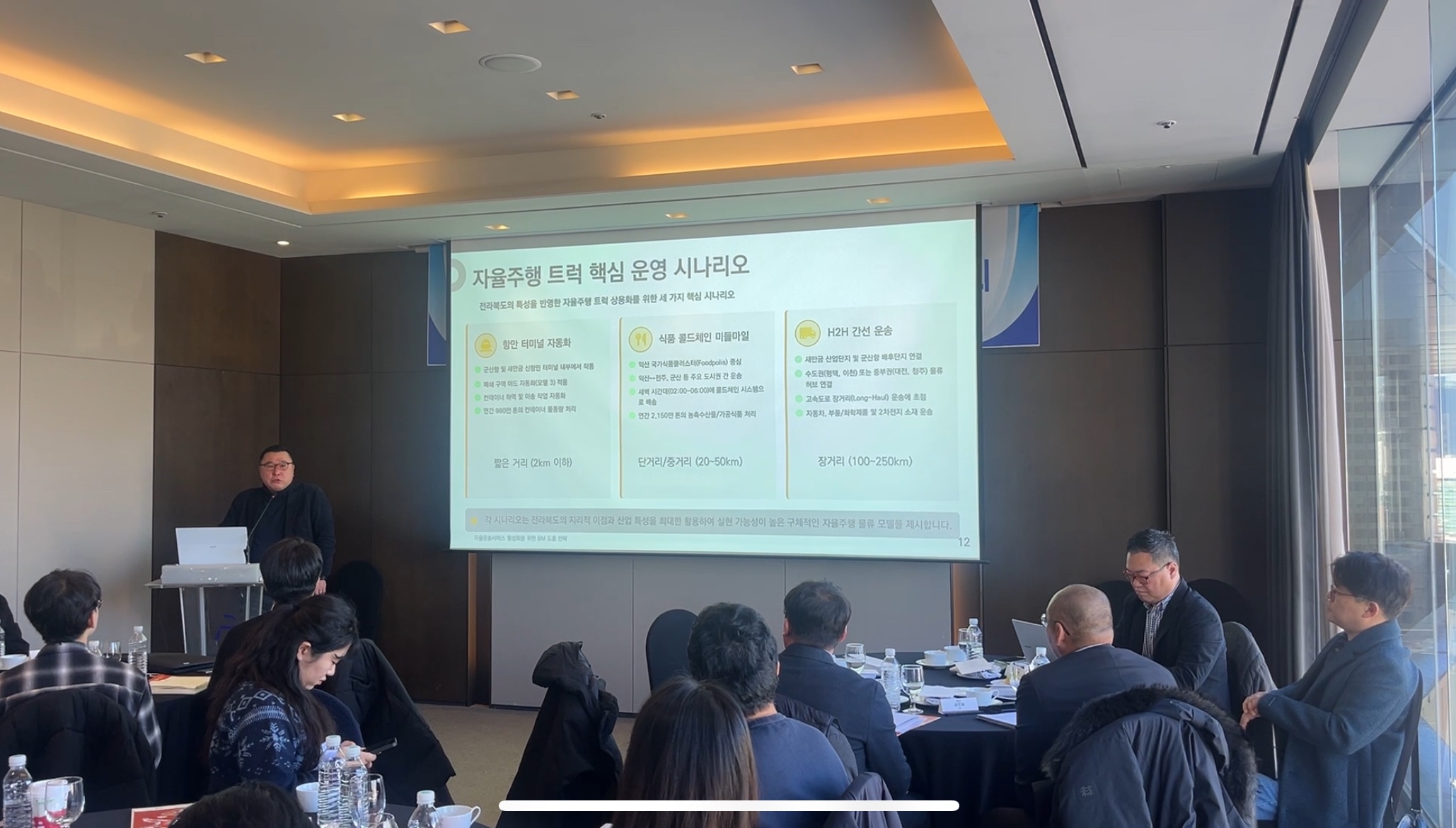 다음으로 영산대학교 권구포 교수가 발표를 진행하였다. 자율운송 서비스 비즈니스 모델을 도출하기 위한 연구과제를 진행하였고 결과를 발표하였다. 권구포 교수는 "기술이 아무리 좋아도 수익을 내지 못하면 지속가능성은 없다." 협의체는 전북의 지리적·산업적 특성을 반영한 3가지 핵심 비즈니스 모델(BM)을 도출했다.